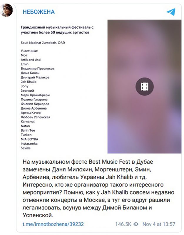 Теперь вот на музыкальном фестивале «Best Music Fest» в Дубае замечены Даня Милохин, иноагент Моргенштерн, Эмин, Диана Арбенина, любитель Украины Jah Khalib и тд. Все эти персонажи, многие многократно, были героями проекта Блокнота "Пятая колонна".