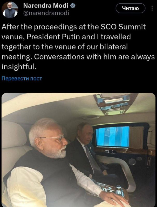«После завершения мероприятий на саммите ШОС мы с президентом Путиным вместе отправились к месту нашей двусторонней встречи. Беседы с ним всегда содержательны», - подписал Моди в соцсетях фотографию, сделанную в автомобиле.