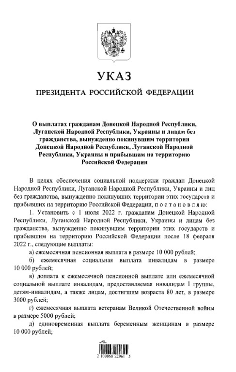 Президент России Владимир Путин подписал указ о выплатах беженцам с Украины, из ДНР и ЛНР. Прибывшим в РФ гражданам соседних республик назначена ежемесячная пенсия в размере 10 тысяч рублей, ежемесячная выплата ветеранам в 5000 рублей и единовременная выплата в 20 000 рублей при рождении ребенка. Соответствующий документ опубликован на официальном интернет-портале правовой информации.