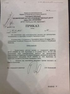 30 января 2015 года в государственном космическом научно-производительном центре имени М. В. Хруничева был подписан приказ № 45. Генеральный директор предприятия Андрей Калиновский изменил правила установления норм командировочных расходов на территории Таможенного союза. Контроль за исполнением приказа был возложен на главного бухгалтера госкомпании.