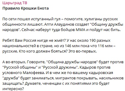 «По сети пошел испуганный гул – помогите, хулиганы русских общинности лишают. Апти Алаудинов создает «Общину дружбы народов». Сейчас наберут туда бойцов ММА и пойдут нас бить.