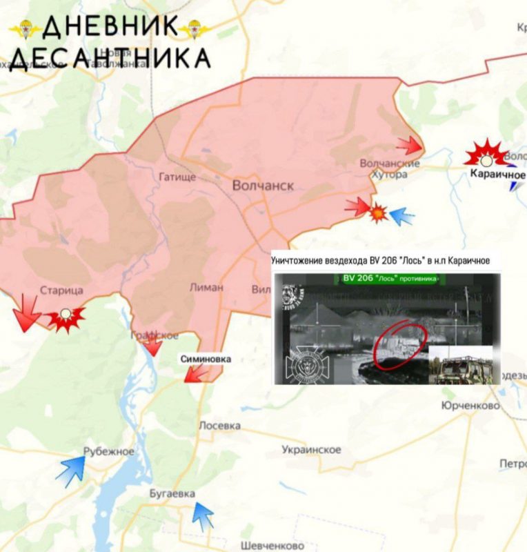 Враг подтягивает резервы к лесным массивам возле Рубежного и Бугаевки, чтобы замедлить продвижение российских войск вдоль берегов Северского Донца. Продолжаются бои за Волчанские Хутора, где российские подразделения захватили несколько домов и огневую позицию противника. В районе Караичного расчет 71-й механизированной стрелковой дивизии «Север» уничтожил бронемашину противника. В Чугуновке российские силы продвинулись, взяв под контроль несколько лесопосадок и приграничные лесополосы.