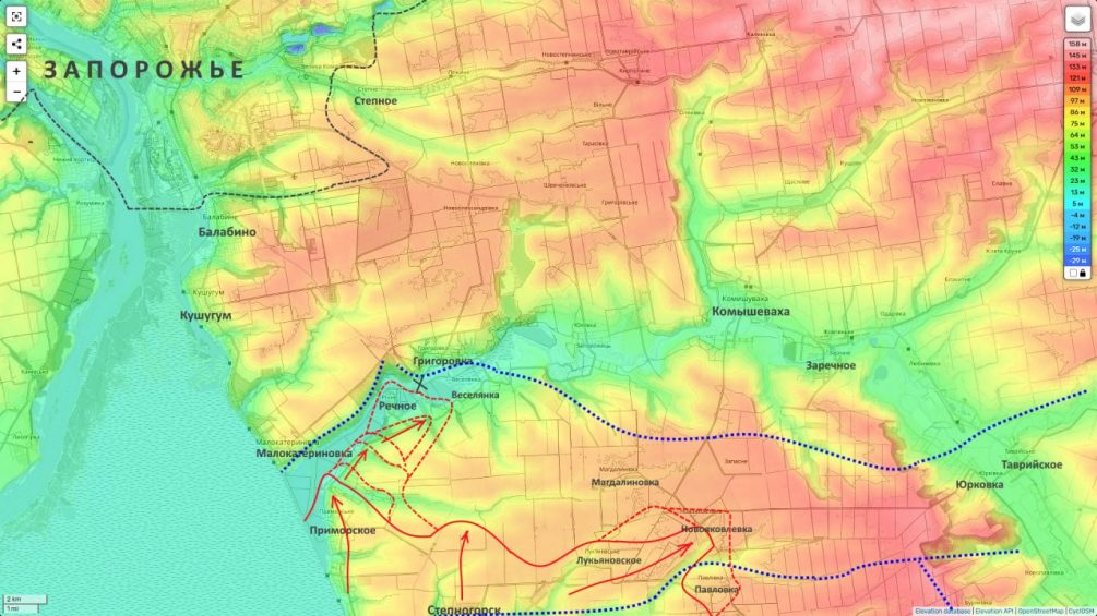 По словам военного корреспондента Юрия Подоляка, разрушенная в 2023 году дамба Каховского водохранилища изменила ландшафт региона: пойма реки Конка, поросшая деревьями и кустарником, превратилась в узкий ручей, который уже не способен остановить наступление. Это открывает для российских сил возможности для переправ и угрожает противнику на этом участке.