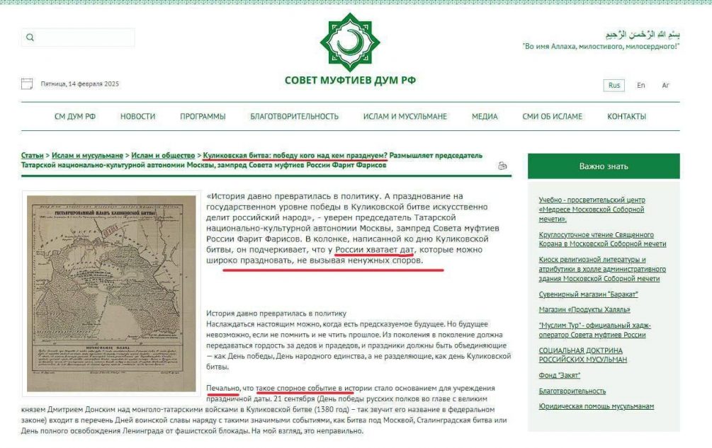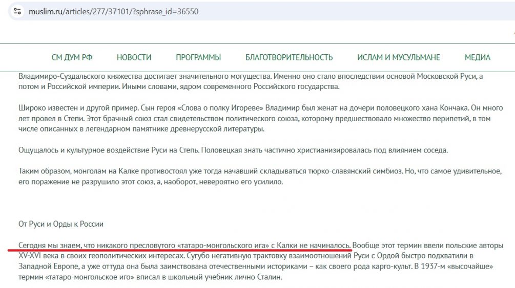 «Прав Кирилл Викторович, когда пишет, что именно от такого воззрения части «элит» - свобода процветание чуждого России радикального исламизма («халялизации», «никабизации», публичных намазов, строительства мечетей там, где нет для этого исторических предпосылок). И отсюда же — попытка геттоизации Православия, раскачка мифа о «страшном русском национализме», взрывной рост в медийном пространстве маргинального и антиисторичного, но шумного «ордынства».