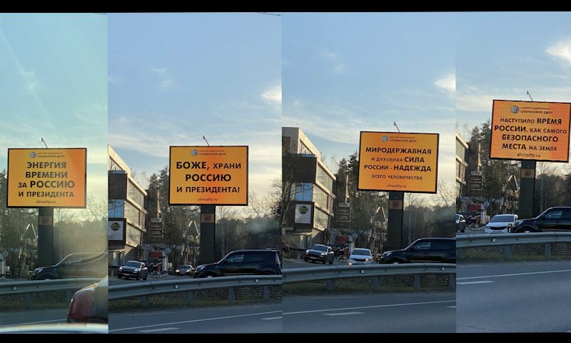 Слоганы на щитах такие: «Боже, храни Россию и президента», «Наступило время России как самого безопасного места на земле», «Миродержавная и духовная сила России - надежда всего человечества» и так далее.