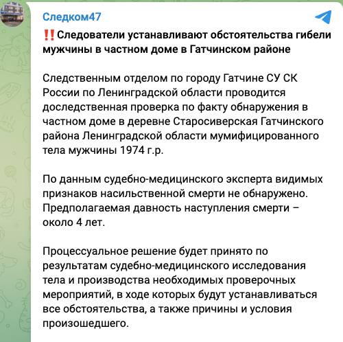 Жуткий случай произошел в селе Старо-Сиверское Гатчинского района (Ленинградская область). Многодетная мать четыре года жила с мумией мужа в супружеской постели. А четверых детей так запугала, что те держали язык за зубами.