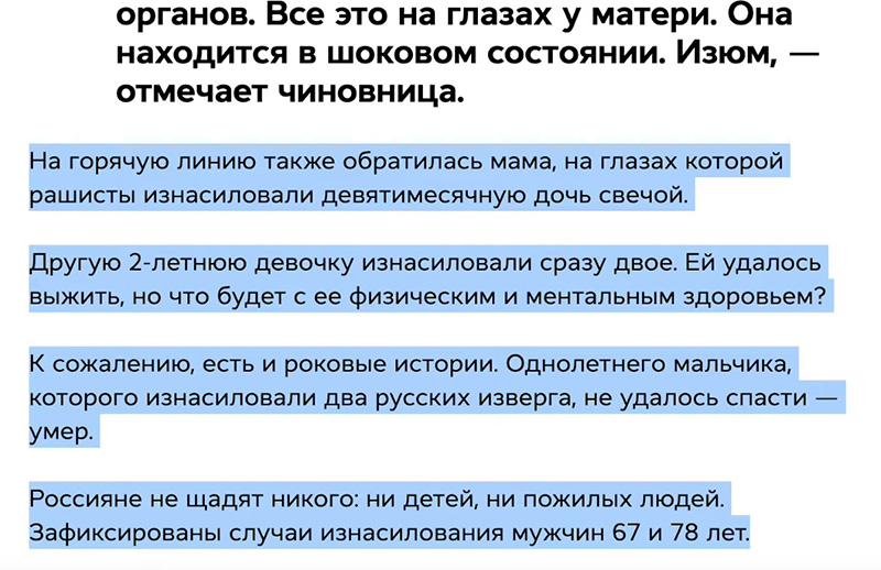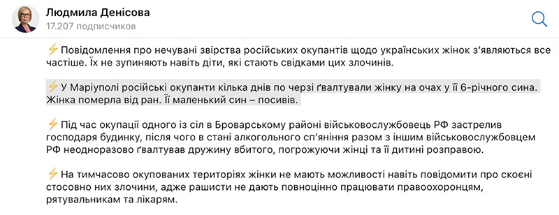 «Двое девочек 12 и 15 лет изнасилованы рашистами. Девочка 6 месяцев, россияне насиловали чайной ложкой. Двое мальчиков-близнецов двухлетнего возраста вместе с мамой были дома. Дети погибли от полученных разрывов и потери крови. Трехлетнего мальчика на глазах матери изнасиловали два рашиста, от полученных травм ребёнок умер», - рассказала Денисова.