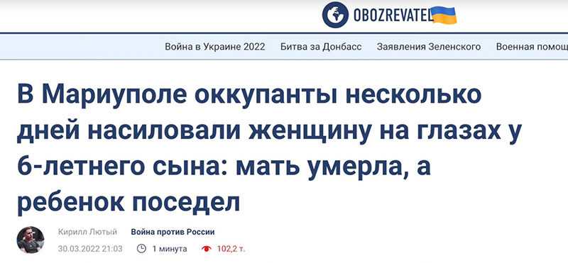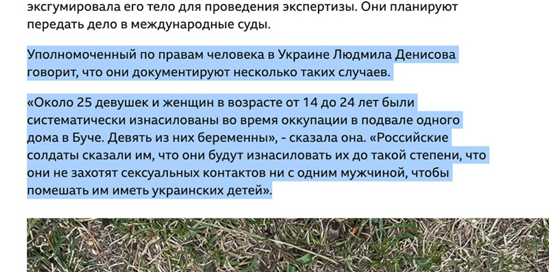 Причем, когда Буча уже была под контролем Украины, никто из местной полиции не смог показать тот подвал, где, якобы, насиловали женщин. Сама Денисова, углубляясь в извращенные подробности фейковых половых преступлений, не смогла привести ни одного доказательства изнасилований - её слова вообще не подвергали сомнению, ведь она была голосом официального Киева.