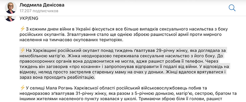 Краткий перевод: «На Харьковщине российский оккупант неделю насиловал 29-летнюю женщину, которая присматривала за больной матерью. До правоохранительных органов женщина не могла дозвониться, потому что рашист разбил её телефон. Когда оккупант заговорил о любви, женщина отказала и тогда он застрелил больную мать на глазах женщины».