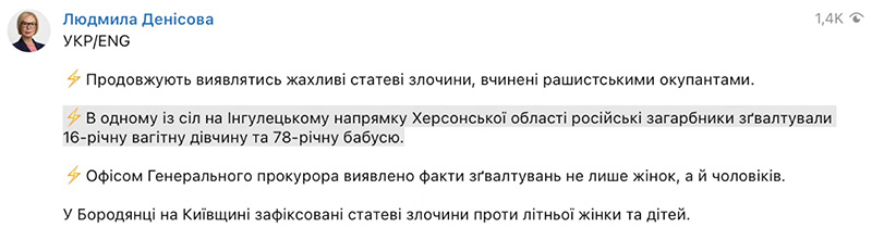 «В одном из сёл в Херсонской области российские захватчики изнасиловали 16-летнюю беременную девушку и 78-летнюю бабушку»