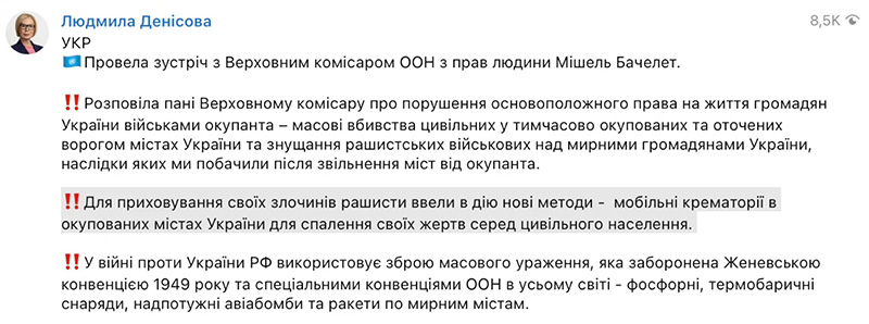 «Чтобы скрыть следы своих преступлений рашисты ввели новые методы - мобильные крематории на оккупированных территориях Украины, для сжигания жертв среди мирного населения».
