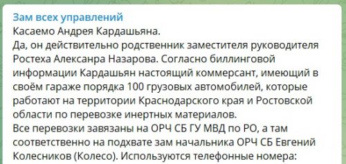 По версии telegram-канала «Зам всех управлений», Кардашян — родственник одного из представителей руководящего состава госкорпорации «Ростех». В его распоряжении, также по сведениям канала, имеется около 100 грузовых автомобилей, которые работают на территории Краснодарского края и Ростовской области.