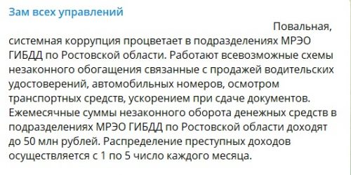 «Ежемесячные суммы незаконного оборота денежных средств в подразделениях МРЭО ГИБДД по Ростовской области доходят до 50 млн рублей. Распределение преступных доходов осуществляется с 1 по 5 число каждого месяца».