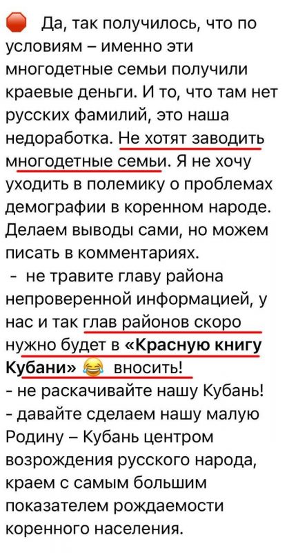 Но администрация была во всеоружии, заранее подготовилась и пошла в «наступление» по принципу «лучший способ защиты - нападение», и обвинила...местных: «По условиям именно эти многодетные семьи получили краевые деньги. Не хотят заводить многодетные семьи...»