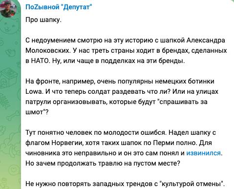 «У нас треть страны ходит в брендах, сделанных в НАТО. Ну, или чаще в подделках на эти бренды. На фронте, например, очень популярны немецкие ботинки Lowа. И что теперь, солдат раздевать что ли? Или на улицах патрули организовывать, которые будут «спрашивать за шмот»? Тут понятно — человек по молодости ошибся. Надел шапку с флагом Норвегии, хотя таких шапок по Перми полно. Для чиновника это неправильно, и он это сам понял и извинился. Но зачем продолжать травлю на пустом месте? Не нужно повторять западных трендов с «культурой отмены»», - написал Григоренко в своем телеграм-канале.