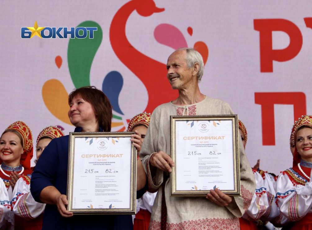 Специально для «Русского поля» мастера-ремесленники со всей страны привезли свои изделия. Владимир Востриков из Смоленской области сплел вручную лапоть из лыка, его длина составила 215 сантиметров, а ширина — 82 сантиметра. Еще один гигантский лапоть (поршень) из бересты привезла костромская умелица Любовь Лебедевой. Второй лапоть получился длиной 210 сантиметров, а шириной – 118 сантиметров.