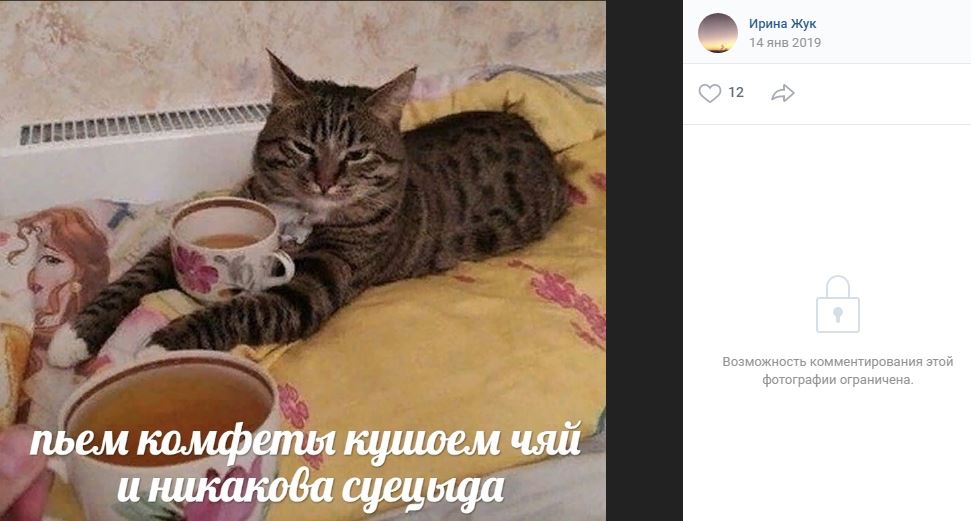 На открытой странице «ВКонтакте» Ирины Жук, среди различных фото есть несколько тревожных «звонков» на тему смерти. В частности, статус, который гласит: «Откладывайте на завтра лишь то, что вы не хотите завершить до самой смерти». А также «мемы с котиками» о суициде, фото «без головы» и пр.