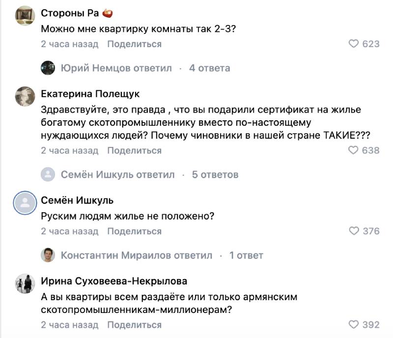 «Здравствуйте, это правда, что вы подарили сертификат на жилье богатому скотопромышленнику вместо по-настоящему нуждающимся людям? Почему чиновники в нашей стране ТАКИЕ?», - недоумевает Екатерина Полещук.
