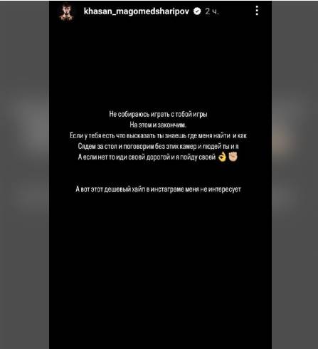 Эти слова и вызвали негодование Хасана Магомедшарипова, который сейчас дерется в американском промоушене Bellator. Спортсмен разместил пост на своей странице в соцсетях, где обозвал Соловьева «чертом» и посоветовал «следить за своим сыном».