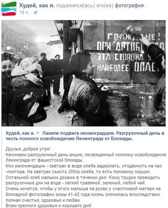 В связи с 71-летием со Дня снятия блокады Ленинграда 27 января в сообществе «Худей, как я» на «Фейсбук» решили организовать акцию - разгрузочный день и сбросить лишнее с помощью «блокадной диеты».