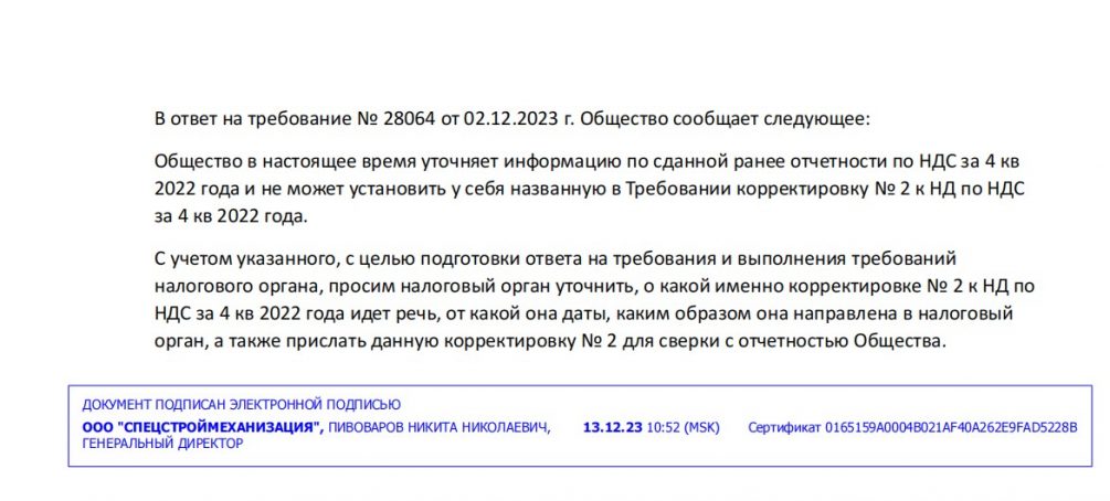 И вдруг, в ноябре 2023 года, непосредственно в момент выездной налоговой проверки в компании ООО ««Спецстроймеханизация», некий Тетёрин Александр Олегович по неизвестно как появившейся у него доверенности через оператора электронного документооборота ООО «СКБ Контур» (уполномоченный орган по обмену электронными документами ), заходит в личный кабинет, формирует уточняющую отчетность ««Спецстроймеханизации» за 3-4 квартал 2022 года и отправляет ее в налоговую. Для «убедительности», как стало известно только в 2026 г., указывает на декларации сотовый телефон Никитиной Г. Из документов получается, что компания подаёт за данный период нулевые декларации на 42 млн руб. При этом ранее бухгалтеры ООО передали в налоговую декларации на уплату налога на те же самые 42 млн.