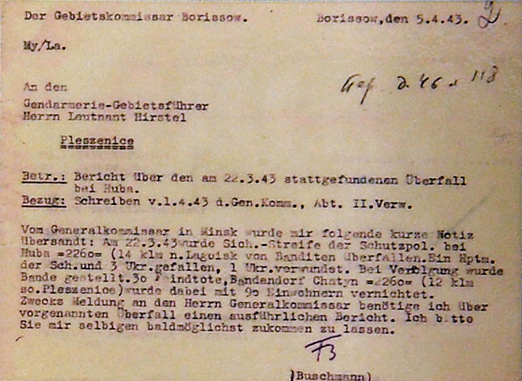 Гитлеровцы были взбешены гибелью Ханса Вельке, который в 1936 году стал чемпионом Олимпийских игр в толкании ядра и был лично знаком с Гитлером. Они стали прочесывать лес в поисках партизан и во второй половине дня 22 марта 1943 года окружили деревню Хатынь.
