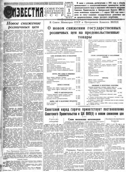При этом с 1947 года неоднократно снижались цены на товары народного потребления. К 1952 году они упали: