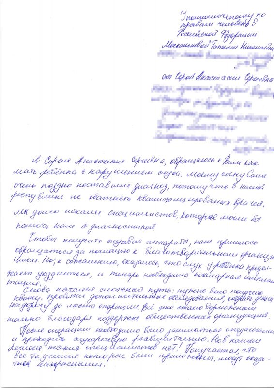 Татьяна также обратилась к Уполномоченному по правам человека в связи с предстоящей заменой речевого процессора: ее дочери крайне сложно ехать на процедуру в федеральный центр. Поэтому мама просит Татьяну Москалькову способствовать созданию мобильных бригад, которые могли бы приехать в Сочи для оказания помощи ее дочери, раз у Краснодарского края не получается создать свою полноценную систему слухоречевой реабилитации.