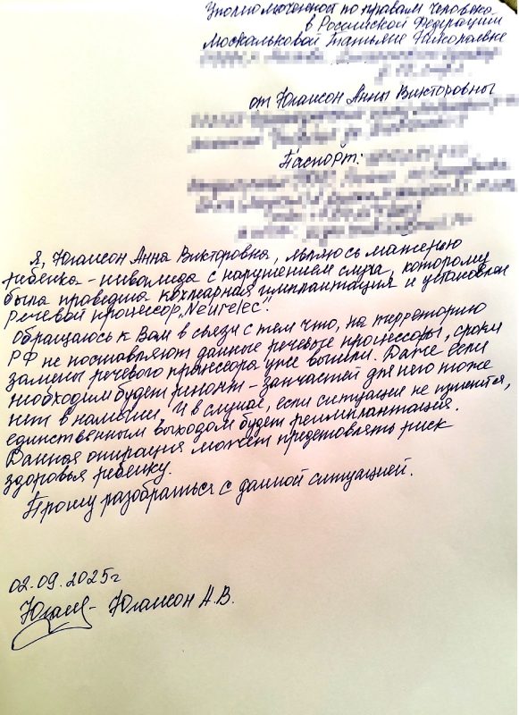 «Таких родителей, как я, по России множество, – пишет она Уполномоченному по правам человека в РФ. - Нам приходят отписки, что все связано с санкциями, СВО и т.д. Что замен данной модели РП нет и не будет. Ремонт вынуждены делать за свой счет. А это десятки, порой – сотни тысяч рублей. И сколько прослужат эти, ремонтируемые годами, аппараты? Дети уже вынуждены носить старые РП, качество звука в которых далеко от идеального. При этом реимплантация предусмотрена только для тех, у кого вышел из строя имплант внутри».