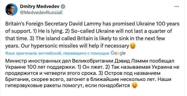 «Остров под названием Британия, скорее всего, затонет в ближайшие несколько лет. Наши гиперзвуковые ракеты помогут, если понадобится», - указал Медведев.