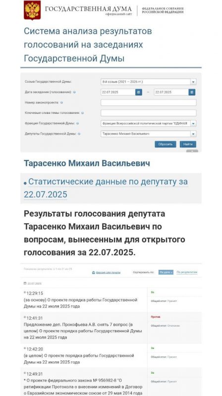 Например, он поддержал закон «О денонсации Конвенции о водно-болотных угодьях» и законопроект, позволяющий женам погибших участников СВО пользоваться их транспортом до вступления в наследство. Обычно такие ситуации в ГД объясняют тем, что на время болезни депутаты передают карточку для голосования коллегам и те голосуют за них. Вероятно, так произошло и с Тарасенко.
