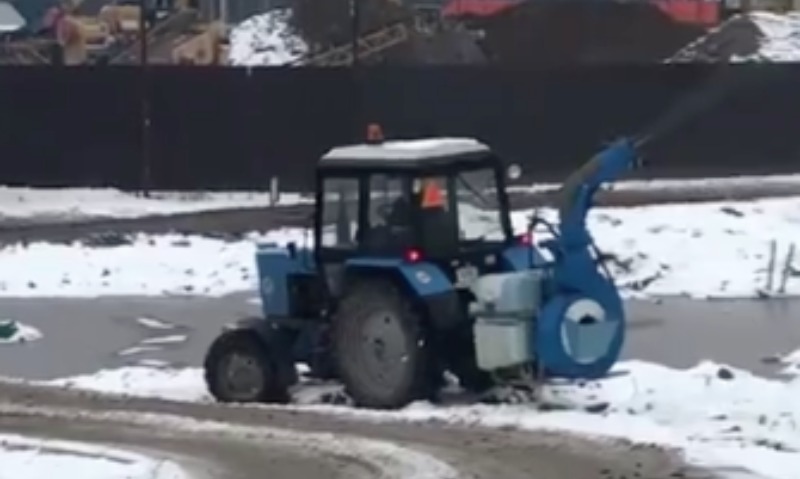 На записи видно, как трактор распыляет с помощью специальной установки некое ароматическое вещество - «для того, чтобы уменьшить характерный запах», говорит голос за кадром.