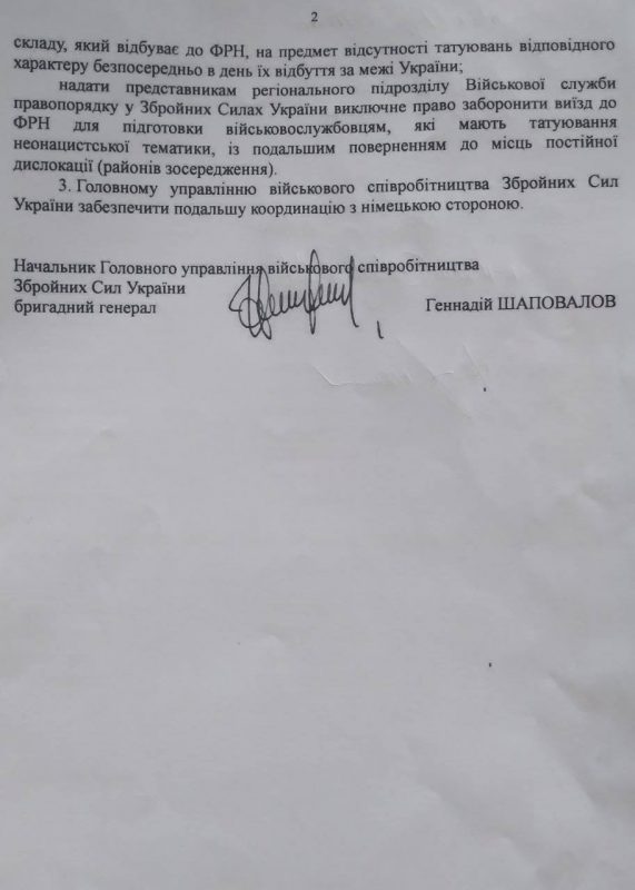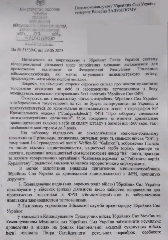 «Украинское военное командование принимает меры, решено отправляемых на учебу солдат и офицеров ВСУ осматривать и имеющих нацистские тату на учебу в Германию не отправлять», — говорится в докумете.