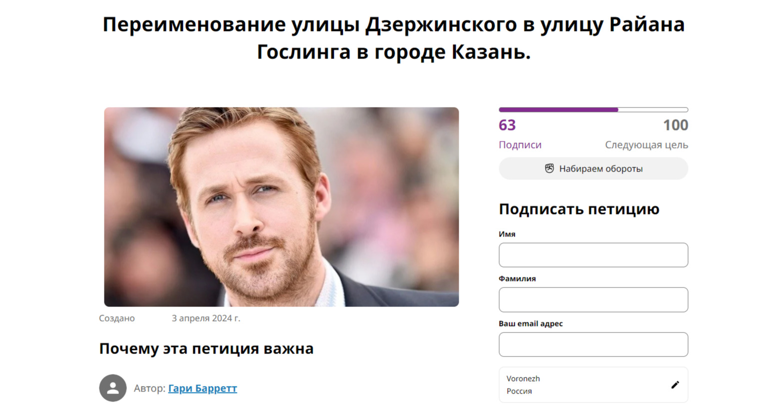 В Кирове и в Казани местные жители подписали петиции на портале Change.org с просьбой переименовать улицы Дзержинского в честь Райана Гослинга. По их мнению, это улучшит имидж городов, повысит привлекательность районов и привлечёт туристов.