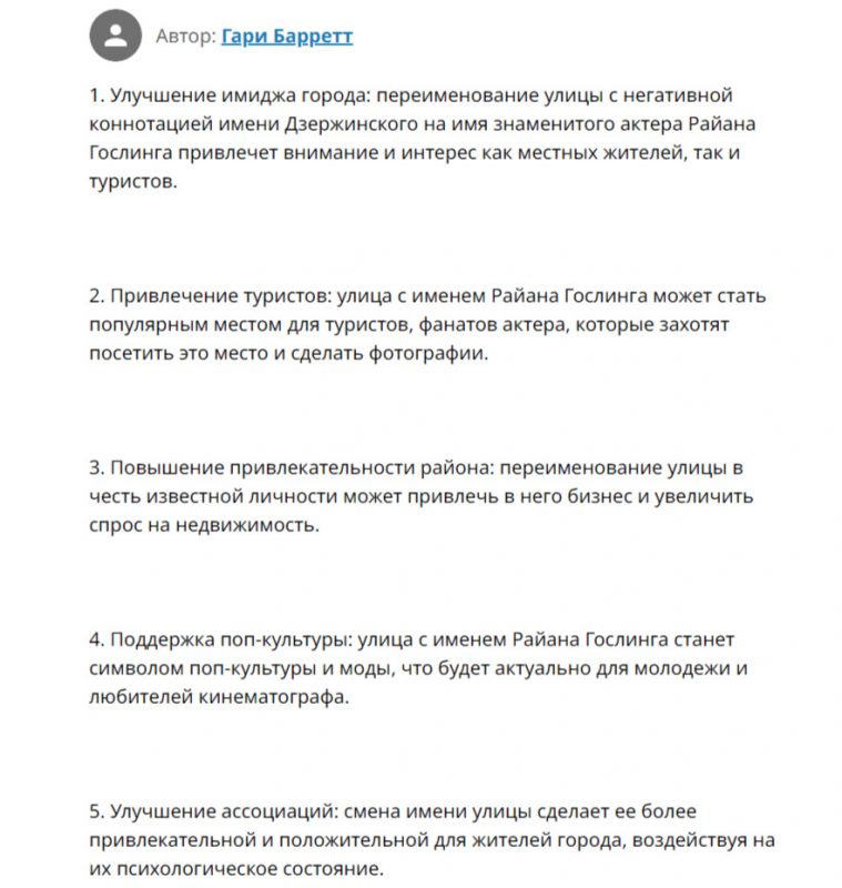 По мнению автора казанской петиции Гари Барретта, улица, которая носит имя Райана Гослинга может стать символом поп-культуры и моды. Это актуально для молодого поколения и фанатов кино.