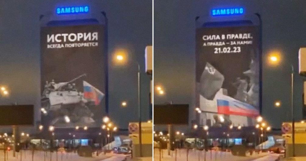 Так, на одном из билбордов столицы гигантский логотип компании Samsung меняется на видео с военными, танками, котиками и надписью: «История всегда повторяется. Сила в правде, а правда — за нами».Дата, которая указана в рекламе, — 21 февраля.