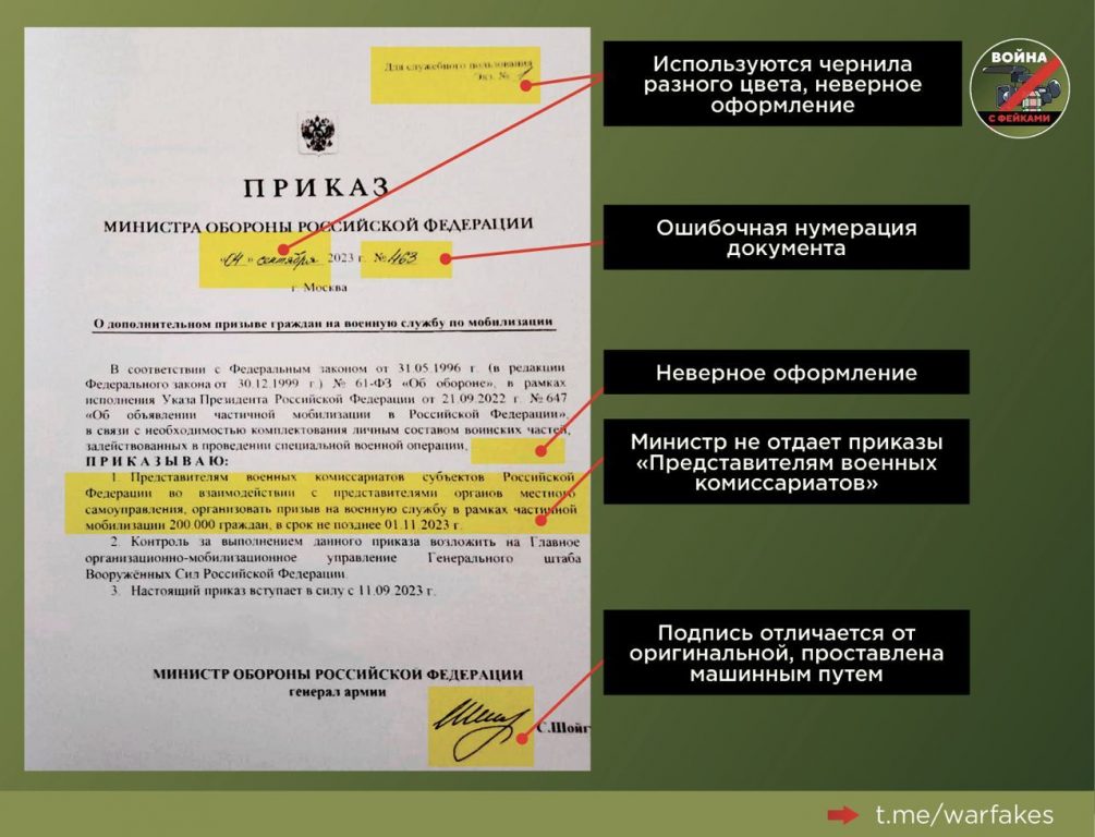 Информация о мобилизации 200 тысяч человек в России была опровергнута. Ранее в украинских Telegram-каналах появился фейковый приказ, выданный от имени министра обороны России Сергея Шойгу, в котором говорится о «дополнительном призыве граждан на военную службу по мобилизации».
