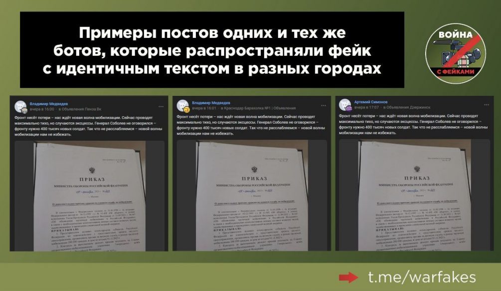 Telegram-канал «Война с фейками» утверждает, что липовый документ изготовили украинские ЦИПсО для дестабилизации ситуации в России. Распространение началось с небольших украинских каналов, после чего фейк подхватила вся телеграм-сетка украинских дезинформаторов