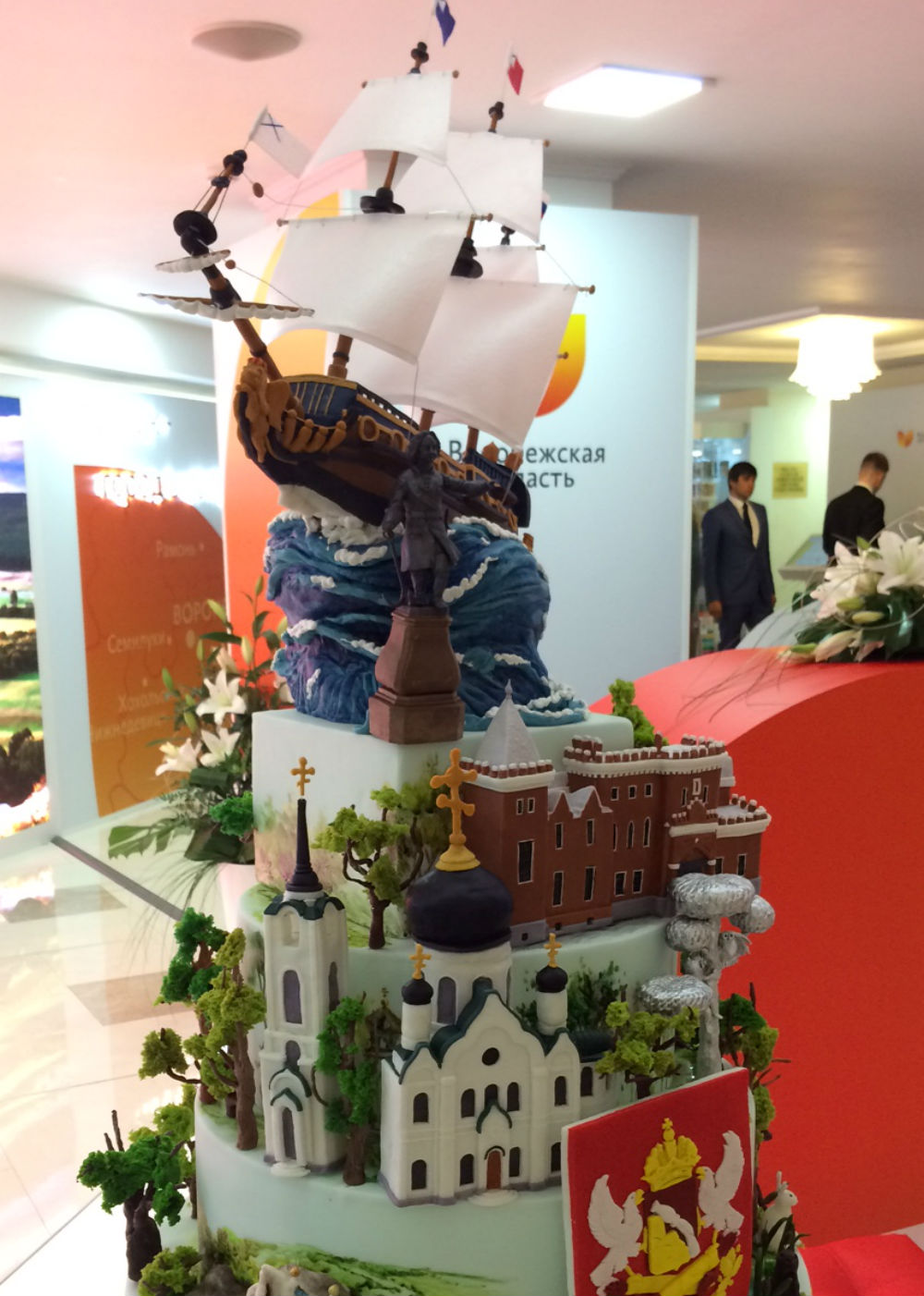 В завершение открытия презентации Воронежской области губернатор Алексей Гордеев презентовал председателю Совета Федерации уникальное кондитерское изделие, на котором объемно показаны известные достопримечательности региона. Кондитерам удалось детально воссоздать замок княгини Ольденбургской, памятник котенку с улицы Лизюкова, историческую копию корабля «Гото Предестинация». Валентина Матвиенко отметила искусность торта и мастерство кондитерского дома «Марципан».