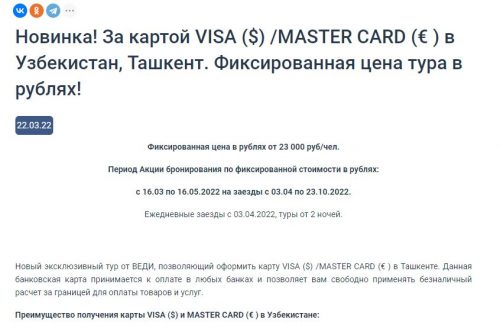 Туроператор уточняет, что путешественники не только побывают в столице Узбекистана, но и получат возможность быстро и просто оформить карту, которую можно будет «свободно применять за границей для оплаты товаров и услуг». Для оформления карты понадобится только загранпаспорт, а бонусом станет открытие рублевого счета, привязанного к карте. Преимуществами оформления карты именно в Узбекистане становится не только простота и скорость, но и удобное приложение и его поддержка на русском языке.