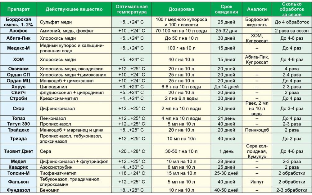 Первая половина лета - звездный час для фунгицидов, препаратов от грибковых и бактериальных болезней садовых и огородных культур. Ими еще можно обрабатывать большинство растений, так как в это время их действие самое сильное и значительное. Если упустить момент, потом с болезнями растений можно не справиться, настолько они прилипчивые. А чтобы обработки не прошли впустую, изучите нашу таблицу.