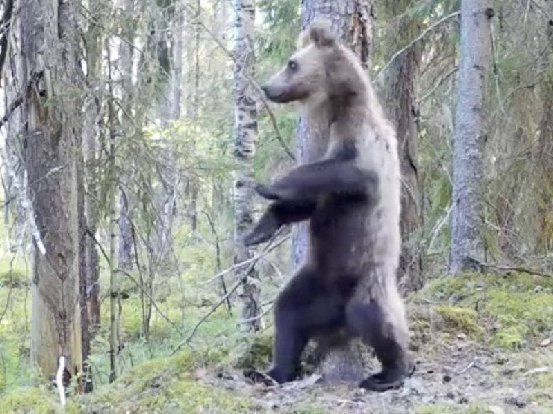 В соцсетях появилось видео, на котором медведь так активно чешется о деревья, что со стороны создается впечатление будто зверь танцует. Пользователи отметили, что движения животного напоминают известный танец «Ламбада».