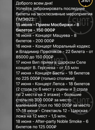 Телеграм-канал Shot выложил еще и расценки билетов на эксклюзивные мероприятия XXV ПМЭФ.