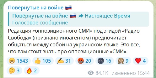 «Редакция «оппозиционного СМИ», действующего под эгидой «Радио Свобода», (признано иноагентом) предпочитает общаться между собой на украинском языке. Это все, что вам стоит знать про оппозиционные «СМИ», - пишут «Повёрнутые на войне».