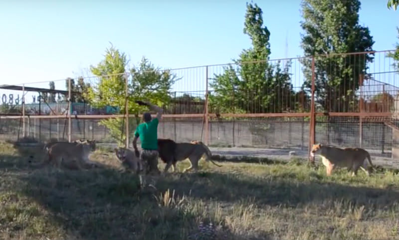 Решительной походкой мужчина подошел к львам, которые прыснули в разные стороны. Вожаку прайда от Зубкова досталось – хозяин запустил в него тапочкой. Потом «волшебное оружие» прилетело и львицам. Тапок охладил хищников, и от львицы они отстали.