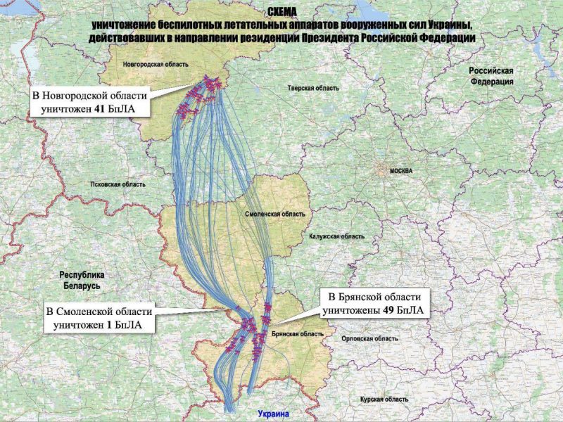 Удар наносился по нескольким направлениям через воздушное пространство Брянской, Смоленской, Тверской и Новгородской областей. Все беспилотники были уничтожены российскими силами ПВО в ходе противовоздушного боя. На карте отмечены зоны их поражения: 49 БПЛА сбиты над Брянской областью в несколько этапов с вечера 28 декабря до утра 29 декабря, один — над Смоленской областью в 01:50, и 41 — над Новгородской областью в период с 03:18 до 08:30 утра.