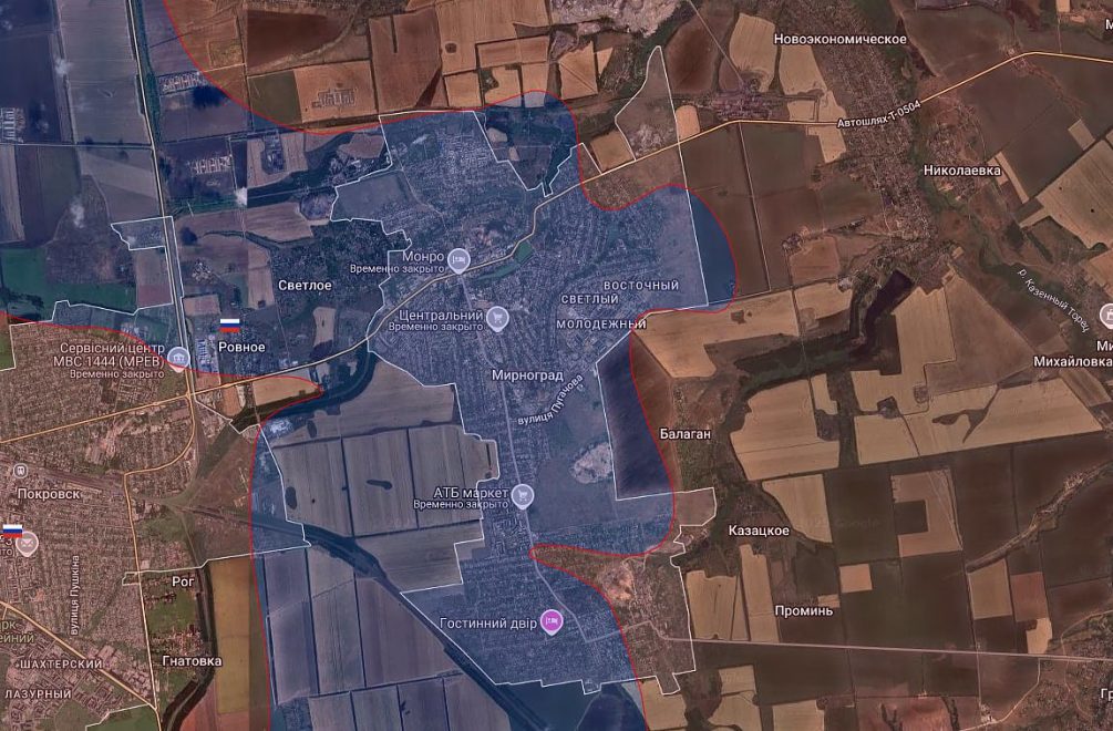 В Мирнограде российские подразделения полностью окружили украинские силы. Бои идут в центре города. Институт изучения войны сообщает, что ситуация для украинской стороны крайне сложная, а российское командование сконцентрировало на этом направлении значительные силы — до 150 000 человек.