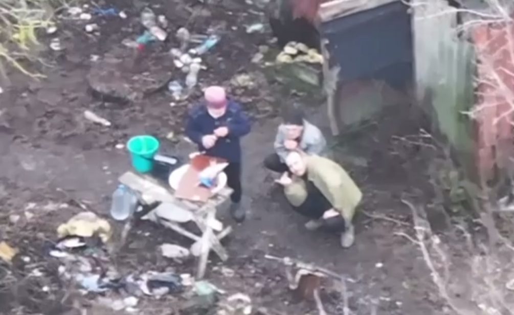 Боевик попытался сбить коптер из автомата и даже передал оружие гражданским, чтобы те попробовали сбить «птичку». Но сбить не получилось. Тогда храбрые защитники решили «накрыть поляну» прямо перед дроном. На кадрах они выпивали и закусывали.