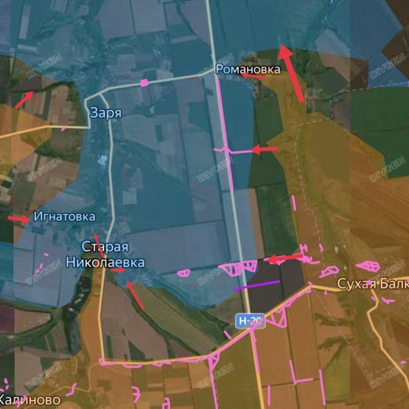 На западном участке наши войска атакуют позиции в районе Игнатовки и Зари, ведя бои за господствующие высоты. На восточном направлении продвижение идет вдоль балки Сухая к стратегически важной высоте 184.4 севернее Романовки. Успех на этом участке создаст условия для последующего наступления на Катериновку, что позволит перерезать линии снабжения вражеских группировок в Щербиновке и Новоспасском (Петровке).