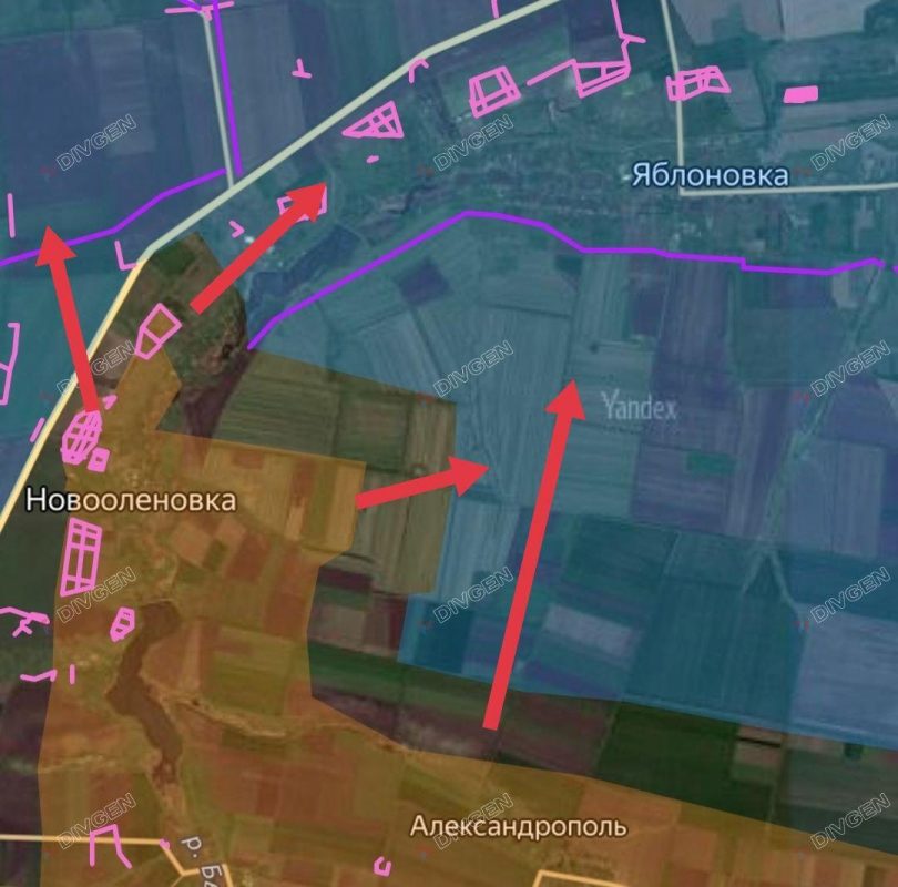 Особенно ожесточенные бои развернулись севернее Александрополя и северо-восточнее Новоалексеевки, где наши подразделения продвигаются к Яблоневке. Контроль над этим населенным пунктом позволит перекрыть ключевой логистический маршрут снабжения группировки ВСУ на юго-восточном направлении, что объясняет упорное сопротивление противника.